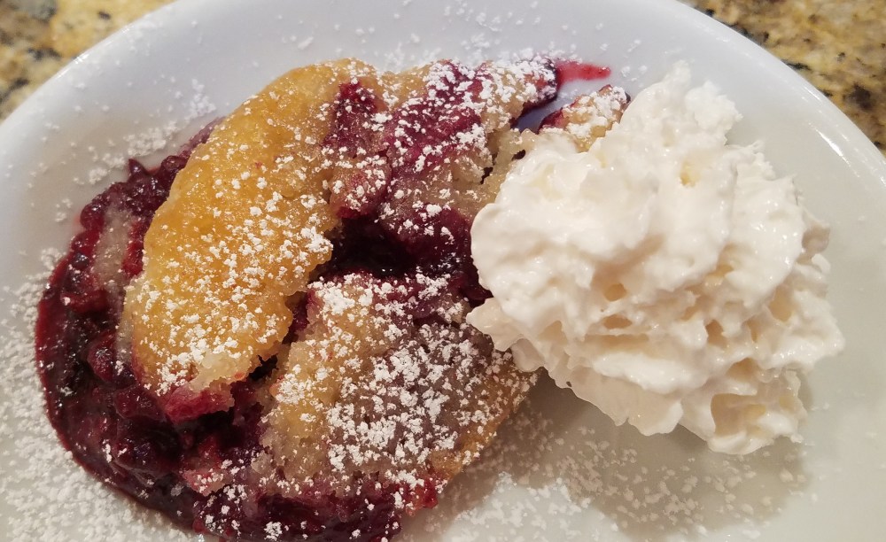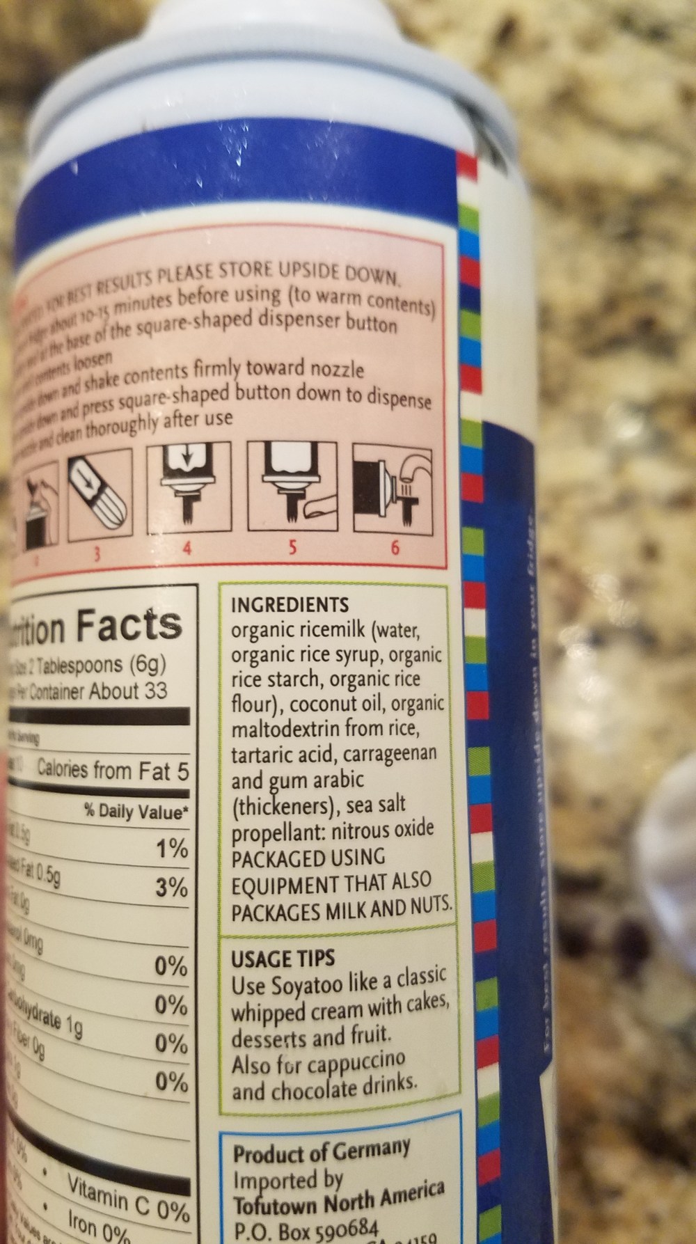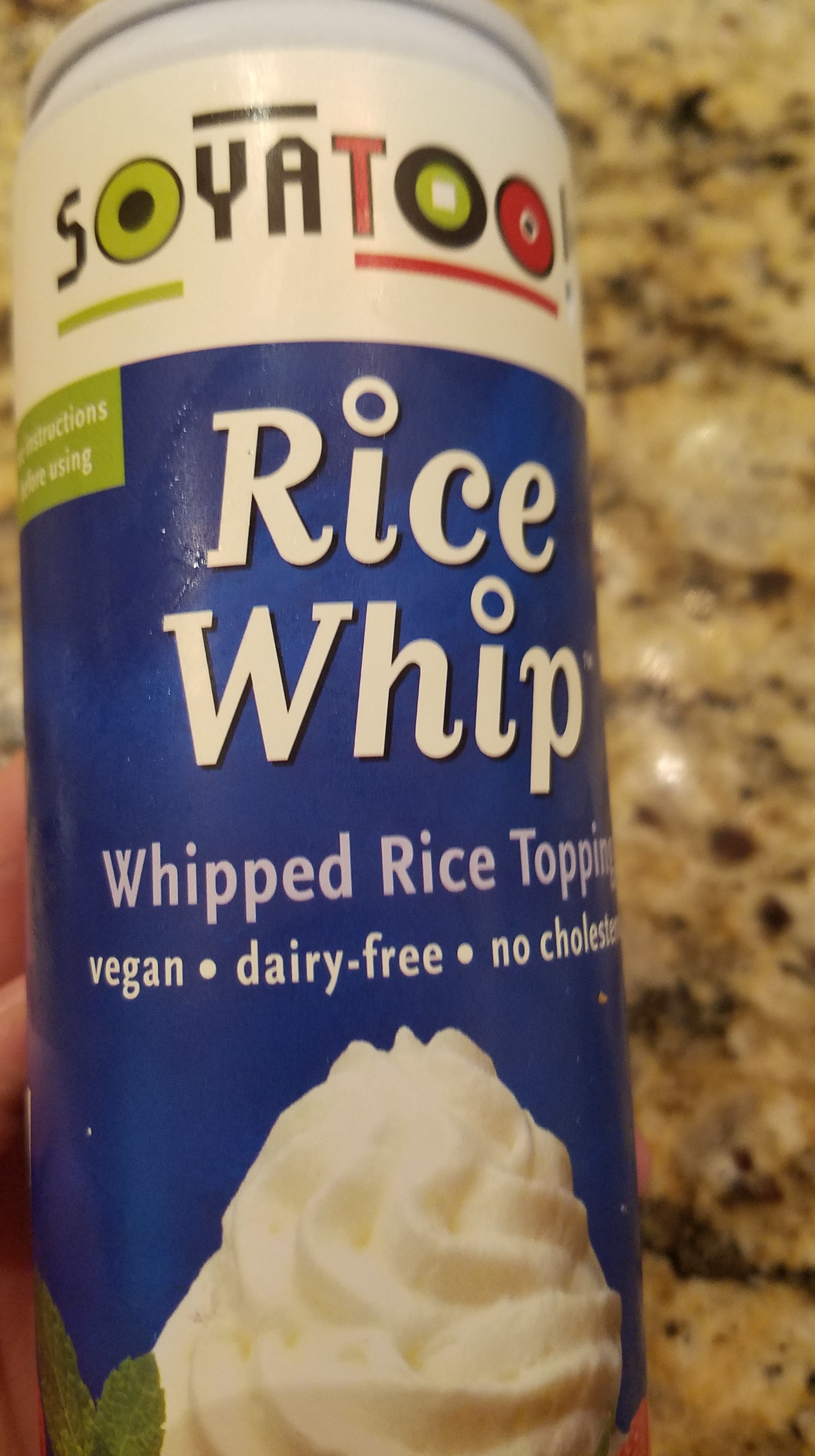 This recipe is based off of this recipe from Betty Crocker. I subbed out the milk for rice milk. I used earth balance ‘butter’ and I used my flour mix that I swear by, from the cookbook Cooking For Isaiah. I also added a bit of brown sugar, maybe 1/4 cup.. Top with WHIPPED CREAM, you heard that right, whipped cream! See pictures below for the brand. This was really good and was so homey and I didn’t miss milk or gluten a bit:)….